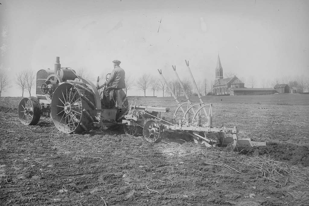 Traktor för treskärig plog. Encylindrig tändkulemotor, 20/24 hk. Vikt 4200 kg.